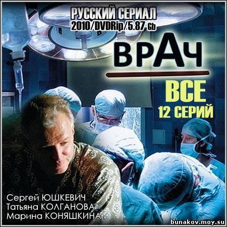 Название: Врач - Все 12 cерий Год выхода: 2010 Жанр: Детектив, Мелодрама Режиссер: Станислав Титаренко В ролях: Сергей Юшкевич, Константин Стрельников, Алексей Фокин, Марина Коняшкина, Полина Воробьева, Александра Сыдорук, Наталья Индейкина, Татьяна Колганова, Юрий Архангельский, Николай Буров, Валерий Гришко, Сергей Дьячков, Артем Анчуков, Ольга Мелехина, Мария Соснякова, Маргарита Гофман, Татьяна Валькова, Мария Никифорова, Ирина Соколова, Лилиан Наврозашвили, Рудольф Кульд, Юрий Герцман, Николай Пархоменко, Виталий Куликов, Антон Забелин, Надежда Мальцева, Светлана Чевычелова, Владимир Чернышов, Владимир Студеновский, Лидия Викторова, Дарина Юшкевич, Анастасия Рысева, Алексей Винников, Егор Бакулин, Дмитрий Рязанцев, Галина Сабурова Редкое сочетание интригующего детектива с великолепной мелодрамой. В одной питерской больнице Борис Головатов, занимающий должность главного врача, решает испытать на пациентах новейшее лекарственное средство «М-трал». Фармацевтическая компания, предоставившая этот препарат, крайне заинтересована в результатах эксперимента. Доктор Иван Важов непосредственно проводит исследование. Но не все проходит гладко, вскоре умирают несколько пациентов…