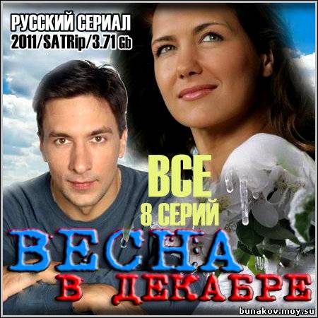Название: Весна в декабре - Все 8 серии Год выхода: 2011 Жанр: Мелодрама Режиссер: Анатолий Матешко В ролях: Григорий Антипенко, Екатерина Климова, Сергей Калантай, Ирина Новак, Константин Корецкий, Игорь Гнездилов, Вячеслав Николенко, Сергей Мельник, Игорь Артюшенко, Валерия Гуляева Перед Вами российский сериал «Весна в декабре», который рассказывает о нежданной любви. Есть ли шанс повстречать свою любовь, когда тебе уже за тридцать? Когда жизнь идет по давно проложенному пути, и всякие непредвиденные повороты на нем не только не ожидаемы, но даже не желательны? Есть ли шанс на то, что настоящее чувство, как молнией, осветит твою жизнь? Героям фильма пришлось испытать как раз такое чувство большой любви, чувство, повернувшее реку их жизни вспять.