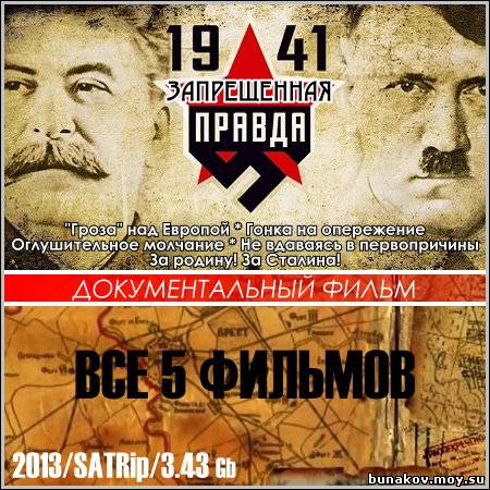 Название: 1941. Запрещенная правда - Все 5 фильмов Год выхода: 2013 Жанр: Документальный, История, Военный, Политика, Расследование Режиссер: Игорь Кобрин Выпущено: Украина, Телекон Продолжительность: 5 х ~ 00:43:00 Перевод: Оригинал Вам представлен документальный фильм-сериал "1941. Запрещенная правда", который откроет зрителям много неизвестных фактов Второй мировой войны. У Вас есть возможность совершенно по-другому взглянуть на суть военного противостояния СССР и Германии, и ход боевых действий в той войне. Этот фильм полностью создан на редких архивных документах с использованием кадров кинохроники 30-40-х годов прошлого века.