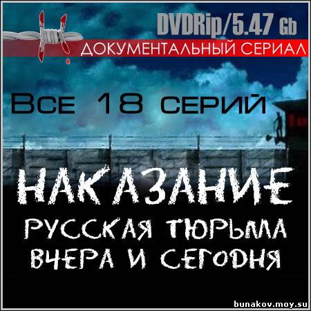 Название: Наказание. Русская тюрьма вчера и сегодня Год выхода: 2006 Жанр: Документальный Режиссер: Олег Шиловский, Виктор Федоров В ролях: Кирилл Набутов Документальный сериал "Наказание. Русская тюрьма вчера и сегодня" рассказывает о пяти веках истории российской пенитенциарной системы, множестве интересных фактов, громких именах и событиях. Тюрьма, уже давно ставшая особой философией и культурой, политикой и этикой, была и остается особым миром, живущим по своим законам. В фильме идет речь о тюрьмах, рационах питания, законах, высшей мере и ее исполнении, знаменитых сидельцах – словом, обо всех и обо всем, кто находился или находится по ту сторону колючей проволоки.