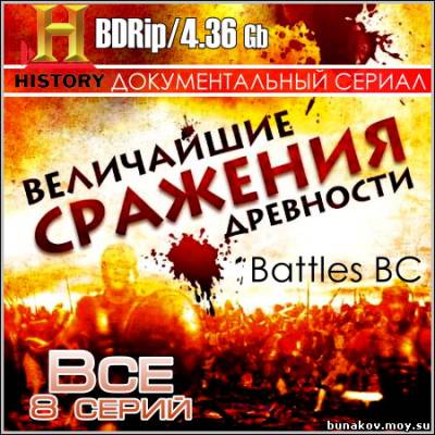 Название: Великие сражения древности - Все 8 серий Оригинальное название: Battles BC Год выхода: 2009 Жанр: Документальный, Исторический Режиссер: Дэвид В. Падруш Перед Вами документально-исторический сериал "Великие сражения древности" (Battles BC). Война – рискованное предприятие, в котором на карту поставлены судьбы цивилизаций. Великие воины древности не имели учебники по тактике и стратегии, не было у них и современного вооружения. Мифы и правда о великих баталиях прошлого, оживших с помощью потрясающей компьютерной графике. Благодаря новым технологиям Вы сможете своими глазами увидеть восстание спартанцев, подвиги Александра Великого, походы Ганнибала, величайших злодеев и воинов, творивших историю до нашей эры.