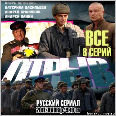 Название: Отрыв - Все 8 серий Год выхода: 2011 Жанр: Драма Режиссер: Сергей Попов В ролях: Игорь Петренко, Катерина Васильева (V), Андрей Смоляков, Андрей Панин, Кристина Кузьмина, Елена Лядова, Николай Добрынин, Игорь Скляр, Владимир Колганов, Андрей Зибров, Кирилл Полухин, Дмитрий Поднозов, Руслан Лукьянов, Александр Стекольников, Егор Бакулин, Андрей Шипицын, Владимир Галась, Денис Кириллов, Александр Русинов Сериал «Отрыв» рассказывает о непростой судьбе двух солдат Великой Отечественной, которые оказались в сталинских лагерях. В 1944 году Алексей Митрохин едва не погиб, и в тот тяжелый момент его жизни пришел ему на помощь комбат Аргунов. В 1947 году, желая выразить благодарность своему фронтовому товарищу, Митрохин приезжает к нему в Москву и узнает, что Аргунов попал в лагерь строго режима. И тогда Алексей принимает отчаянное решение – он обязан любыми силами вызволить своего товарища…
