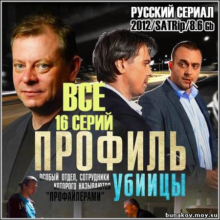 Название: Профиль убийцы - Все 16 серий Год выхода: 2012 Жанр: Боевик, Криминал Режиссер: Владимир Койфман В ролях: Вадим Андреев, Максим Щеголев, Денис Матросов, Владислав Дунаев, Евгений Гусев, Сергей Пиоро, Ольга Куликова, Дмитрий Грачев (II), Артем Кобзев, Сергей Колешня, Елена Любимова, Екатерина Михайлова (III), Александр Никольский (II), Поля Полякова, Валентин Самохин, Тимофей Смирнов, Максим Терлецкий, Константин Тополага, Руслан Ягудин, Николай Бендера, Алексей Бояджи, Дмитрий Буренков, Ольга Молочная, Денис Первойкин, Сесиль Свердлова, Руслан Спояло, Александр Числов, Сергей Васильев (VII), Андрей Белозеров, Сергей Усков, Андрей Негривода, Дмитрий Юмашев, Ксения Суркова, Андрей Зайцев (II), Алексей Овсянников, Игорь Чигасов Сериал «Профиль убийцы» рассказывает о профайлерах, сотрудниках специального, недавно основанного, подразделения в МВД. Занимаются они расследованием особенно запутанных, сложных дел, которые совершают маньяки, насильники и серийные убийцы. Именно эти дела, как правило, становятся так называемыми «висяками», и именно для их раскрытия часто мало обычного подхода. Нужно понять, как думает сам злоумышленник, проникнуть в его сознание и мысли. Собственно этим и заняты герои сериала, всегда идущие по следам отъявленных убийц и психопатов.