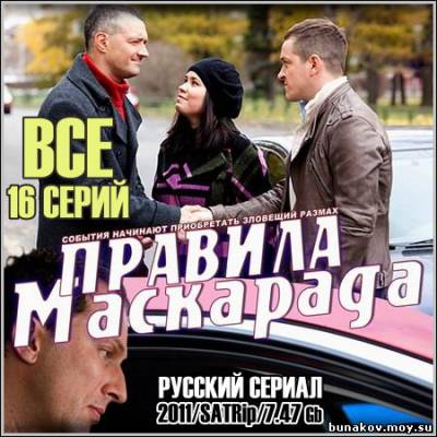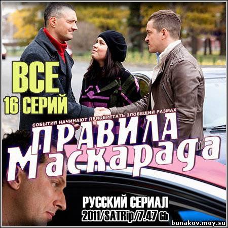 Название: Правила маскарада - Все 16 серий Год выхода: 2011 Жанр: Мелодрама Режиссер: Александр Муратов В ролях: Марина Александрова, Дмитрий Нагиев, Ксения Алферова, Егор Бероев, Карина Карпухина, Екатерина Шпица, Юрий Беляев, Евгения Добровольская, Валда Бичкуте, Александр Баринов, Николай Бендера, Роман Синицын, Руслан Спояло, Михаил Хмуров, Александр Чевычелов, Валерий Кудашкин, Владимир Еремин, Владимир Зайцев, Андрей Денисов, Ольга Мокшина, Сергей Перебоев, Татьяна Морозова Все достаточно хорошо в судьбе известной телеведущей Анны Дружининой, ведущей программы «Правила маскарада». Но, одно случайное слово, сказанное ею в эфире, превращает жизнь Анны в настоящий кошмар. На ее адрес начинают поступать анонимные угрозы. Вскоре на телестудию совершается налет, во время которого неизвестными был уничтожен макет ее книги о событиях 1998 года. Именно об этой книге и упомянула однажды в одной из программ. Полиция не хочет разбираться в этом деле, и Анна обращается к однокласснику Андрею Воронцову. Дальнейшие события наваливаются, как снежный ком. Анна узнает, что у ее супруга есть любовница, и этот факт, вероятнее всего, не единственная тайна ее мужа. Вскоре следует еще более ужасающая новость – ее дочь Дашу похищают прямо из школы.