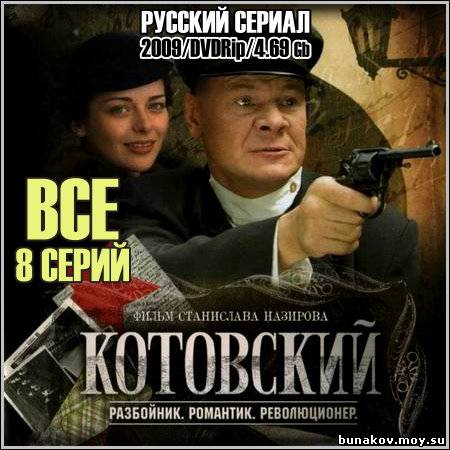 Название: Котовский - Все 8 серий Год выхода: 2009 Жанр: Приключения, История Режиссер: Станислав Назиров В ролях: Владислав Галкин, Марина Александрова, Екатерина Стулова, Максим Лагашкин, Иван Стебунов, Александр Макогон, Олег Васильков, Андрей Гусев (III), Михаил Крылов, Алексей Ошурков, Алексей Горбунов, Александр Пашутин, Владимир Гусев (II), Владимир Симонов, Дарья Михайлова, Дмитрий Прокофьев, Сергей Цепов, Станислав Долгошеев, Владимир Шибанков, Виктор Поздняков, Мария Кирилкина, Сергей Пиоро, Юрий Иванов, Сергей Рубеко, Александра Чилин-Гири Котовский был очень важной фигурой во время революционного переворота начала прошлого века. О нем были сложены легенды. О его героизме и мужестве упоминается во многих книгах. С его именем связано много шуток, что лишний раз говорит о его невиданной известности. В сериале «Котовский» главный герой показан не только как отчаянный сорвиголова и боец, но и как романтик и преданный друг.