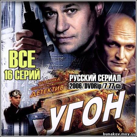 Название: Угон - Все 16 серий Год выхода: 2006 Жанр: Криминал, Детектив, Боевик Режиссер: Василий Бледнов В ролях: Александр Тютин, Александр Цуркан, Михаил Химичев, Виктория Малекторович, Петр Томашевский, Алексей Золотницкий, Борис Шевченко, Юлия Шарикова, Вера Молодых, Вячеслав Гришечкин, Дмитрий Бозин, Валерий Шевченко, Сергей Бурунов, Григорий Данцигер, Вадим Демчог, Николай Шатохин, Илья Рутберг, Борис Химичев, Юлия Пивень, Юрий Назаров, Вячеслав Шалевич, Андрей Межулис, Эвелина Бледанс, Жан Даниэль, Иван Оганесян, Елизавета Горелова, Екатерина Хлыстова, Александр Басилая, Александр Лымарев, Людмила Дмитриева, Сергей Греков, Юрий Шерстнев, Людмила Зайцева, Сергей Габриэлян, Ирина Бякова, Константин Юшкевич, Иван Агапов, Юрий Кузьменков, Александр Лырчиков, Михаил Попов, Михаил Калиничев, Сергей Чирков Седьмой отдел – одно из подразделений МУРа, которое специализируется на расследовании "автомобильных" преступлений. Собственно его работе, изобилующей опасными, коварными загадками и интересными приключениями, которые с успехом разгадывают следователи, посвящен сериал «Угон».