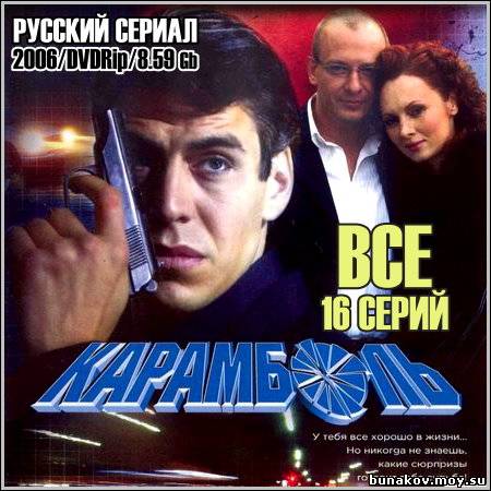Название: Карамболь - Все 16 серий Год выхода: 2006 Жанр: Детектив Режиссер: Владимир Дмитриевский В ролях: Елена Ксенофонтова, Дмитрий Марьянов, Дмитрий Дюжев, Яков Культиасов, Максим Шибаев, Лев Прыгунов, Михаил Васьков, Михаил Жигалов, Григорий Шевчук, Анна Легчилова, Владимир Долинский, Андрей Чернышов, Юлия Пересильд, Алексей Колган, Владимир Капустин, Ирина Лосева, Алла Юганова, Татьяна Жукова-Киртбая, Александр Журман, Борис Эстрин, Татьяна Журавлева, Константин Степанов, Вячеслав Жолобов, Армандс Нейландс-Яунземс, Вадим Александров, Светлана Варецкая, Татьяна Косач-Брындина, Олег Шибаев, Егор Фаддеев, Сергей Краснов, Валерий Прохоров, Александр Бавтриков, Галина Стаханова, Андрей Леонов, Любовь Тихомирова, Сергей Сатин, Константин Желдин, Андрей Абашкин В бильярде позиция, когда один шар отскакивает от другого шара и попадает рикошетом в третий, называется карамболью. Похожие ситуации часто встречаются и в жизни. Нечто подобное произошло и в судьбе главной героини сериала «Карамболь» успешной и красивой Натальи Силантьевой. У нее есть любящий муж и замечательный сын, а также собственное модельное агентство. Силантьева вышла второй раз замуж, будучи уверенной, что она вдова. Неожиданно выясняется, что первый муж живее всех живых. Жизнь превращается во всеобщий бешеный круговорот, так как слишком многие пытаются выйти на воскресшего мужа через Наташу.